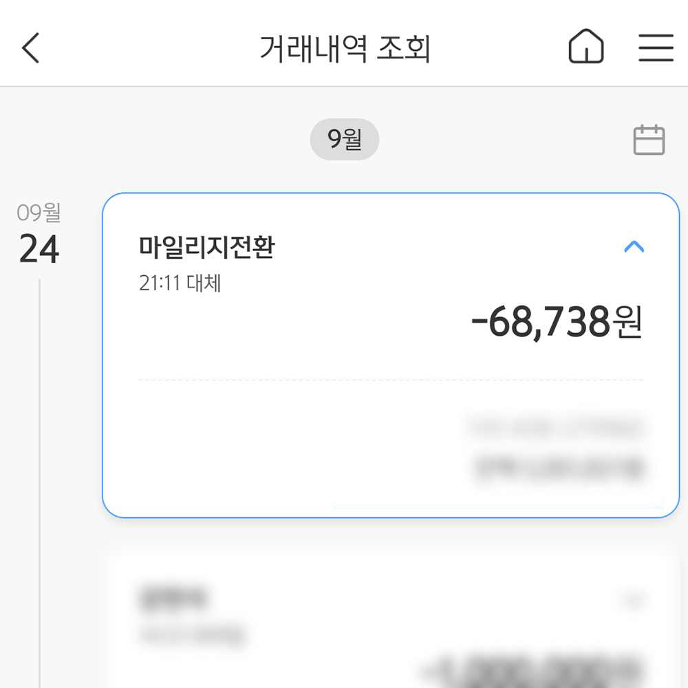 한 가지 더 유의할 점은 마일리지로 전환됐다는 메시지가 떴다고 해서 바로 대한항공 앱에서 변환된 마일리지를 확인할 수는 없습니다. 일정 시간이 지나야 마일리지 변환 여부를 확인할 수 있는 것 같습니다.