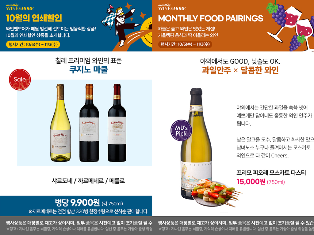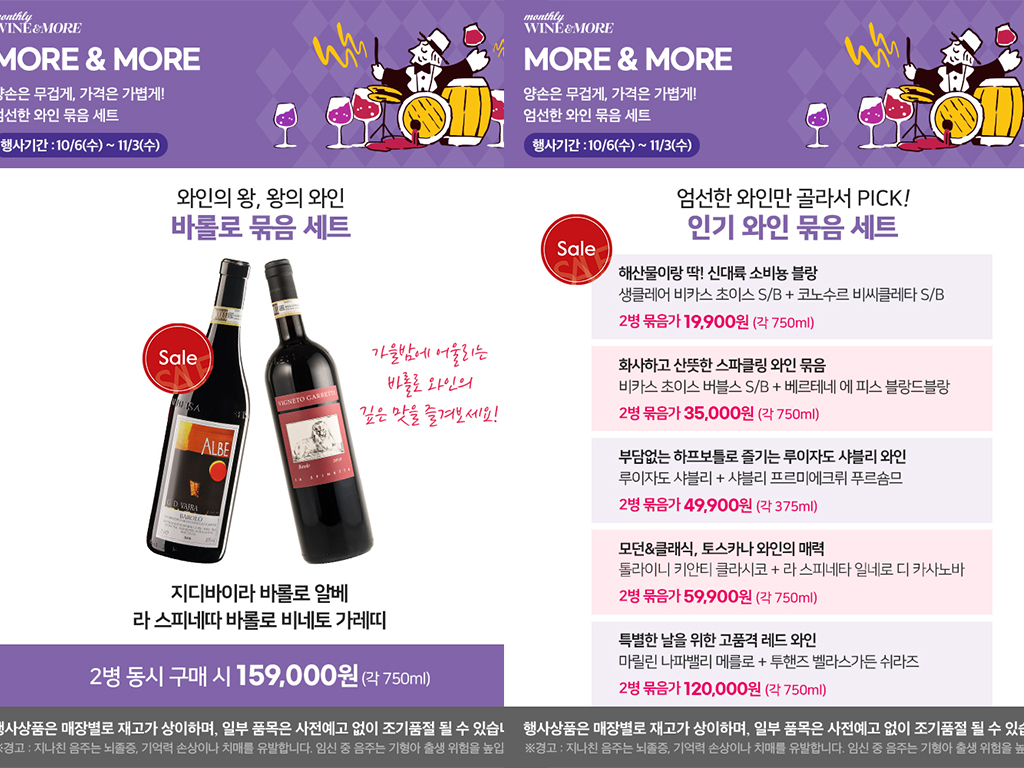프랜차이즈 와인샵인 와인앤모어에서 10월 할인 품목이 나왔습니다. 맥주는 잘 모르니, 와인 중심으로 알아보도록 하겠습니다.