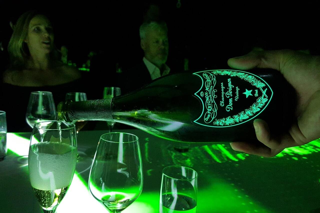 야광 아니냐고 생각하실수도 있는데, 병의 가장 아랫쪽(펀트)에 스위치가 있습니다. 이 버튼을 누르면 돔페리뇽 라벨이 반짝거리면서 빛나게 되는 구조입니다. 워낙 자태가 압도적이라서 한번 보고 나면 절대 잊어버릴 수 없는 모습일 것으로 생각됩니다.