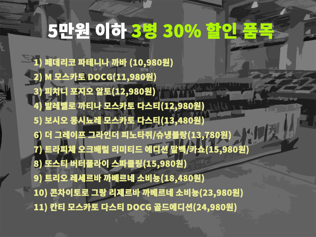 물론 5만원 이하 전 품목이 3병 30% 할인 대상이 되는 건 아닙니다. 정확하게 말씀드리면 지정된 와인에 한해서만 할인이 가능합니다.