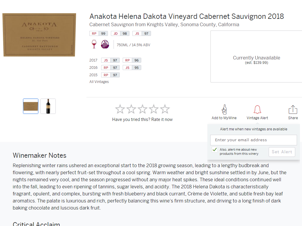 캘리포니아의 컬트와인 아나코타 2011년 빈티지가 19만원에 나왔습니다. 최근 빈티지의 경우 평론가들의 극도로 높은 점수를 받고 있는 와인이기도 합니다. 예를 들어 헬레나 다코타 18빈티지의 경우, RP는 무려 99점에 달할 만큼 좋은 평가를 받고 있습니다.